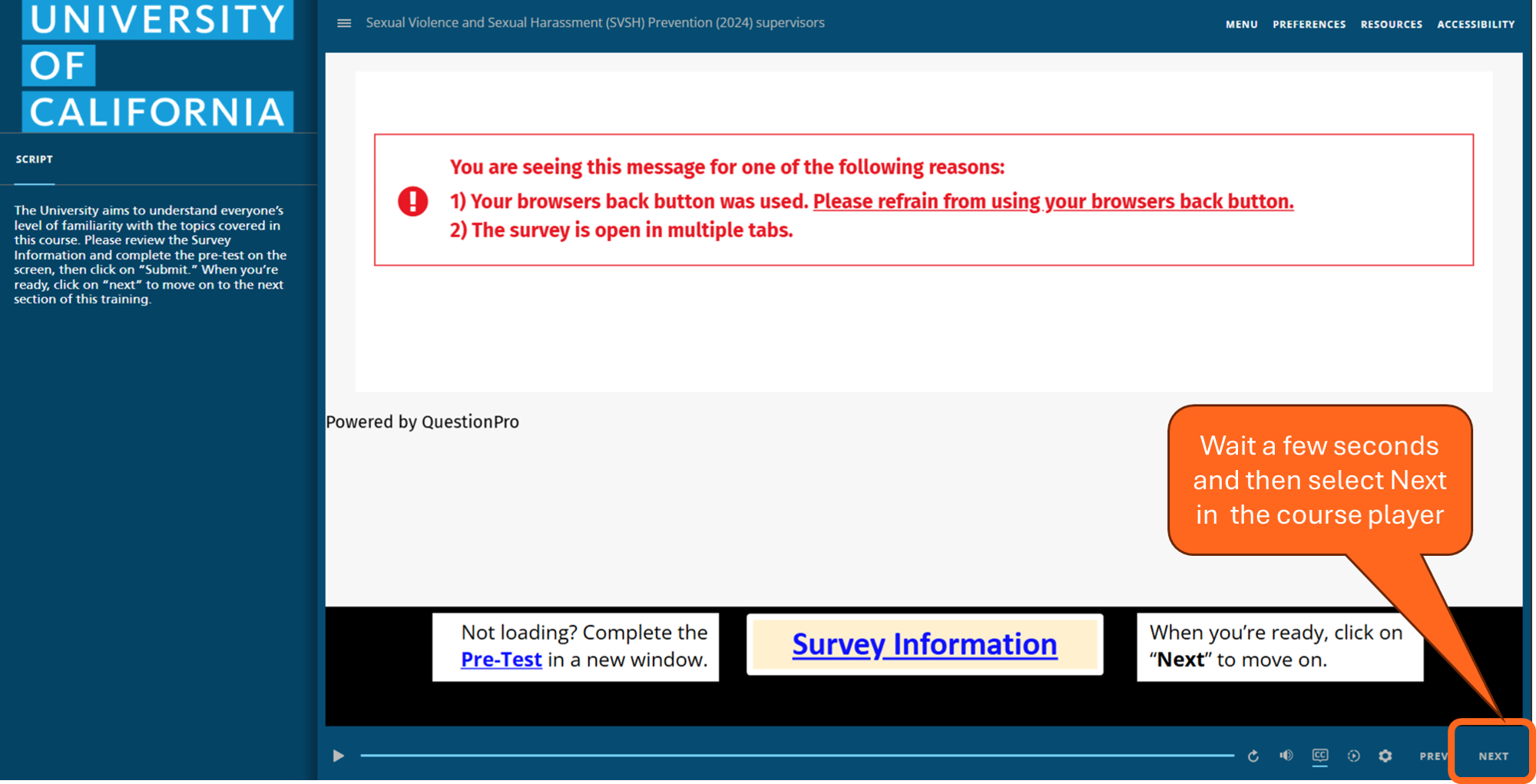 • If you receive an error message when completing one of the embedded surveys or tests in the UC Sexual Violence and Harassment, Anti-Discrimination, Prevention and Education (SHAPE) Trainings, try waiting a few seconds and then selecting the NEXT button in the course player to advance.